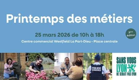 Le mercredi 25 mars 2026, la Ville de Lyon et le CCAS, en partenariat avec la Maison Métropolitaine d'Insertion pour l'Emploi (MMI'e), la Mission Locale de Lyon, l'association ALLIES, France Travail, CAP Emploi et l'APEC organisent la 3ème édition du Printemps des Métiers au cœur du centre commercial Westfield La Part-Dieu, de 10h à 18h.