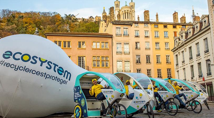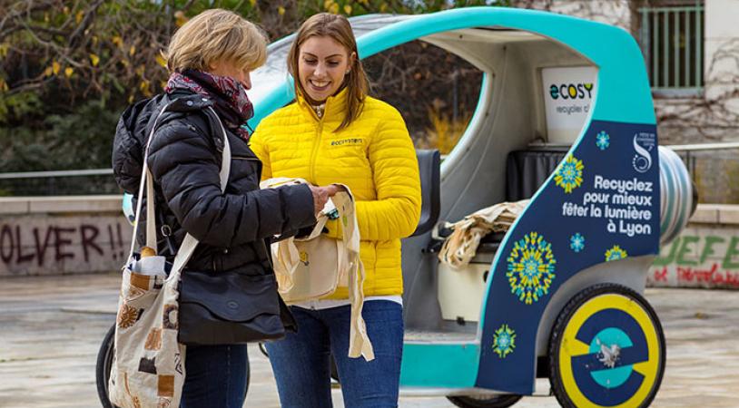 Des triporteurs en forme d'ampoules, aux couleurs d’ecosystem et de la Fête des Lumières, circuleront autour des installations et permettront aux ambassadeurs d’aller à votre rencontre pour vous informer sur les points de collecte des ampoules les plus proches de chez vous. Des sacs en toiles pour transporter les ampoules et un dépliant informatif sur le recyclage seront également distribués.