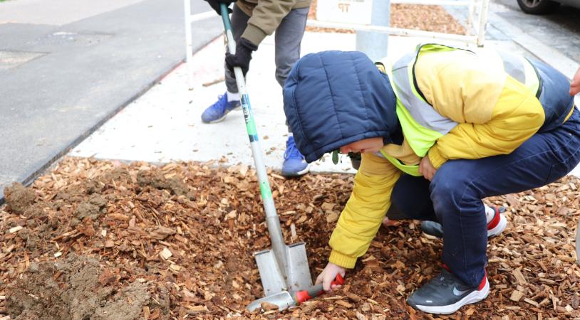 Ce lundi 27 novembre, une cinquantaine d'élèves de CM1 et de CM2 de l'école Cornier ont quitté leur cahier pour les houlettes, le temps d'une matinée, afin de participer à la plantation d'arbustes et d'aromatiques avenue Cabias. Accompagnés par l'animateur de Lyon Nature, les enfants ont d'abord appris quelques notion de base de jardinage. Pelles, bêches, râteaux, houlettes pour quels usages ? À quelle profondeur creuser ? Qu'est-ce que le mulch ? Comment démouler une motte ? Puis vient vite la pratique : les mains dans la terre autour des arbres fraichement plantés.