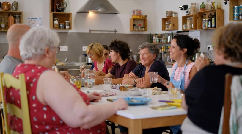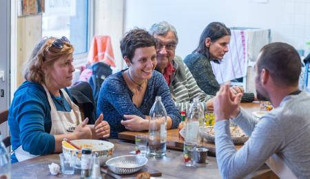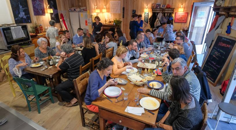 Le repas est l’occasion de rencontrer des convives d’autres générations et parcours de vie. Tout est fait pour faciliter les échanges et se sentir relié aux autres. Ceux qui en ont le temps et l’envie participent à la préparation du repas, au service, à la vaisselle ou au ménage.