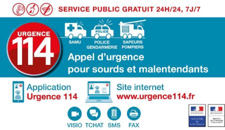 114, le numéro unique et gratuit pour les sourds, malentendants, aphasiques, dysphasiques permet de contacter par SMS ou fax les services d’urgence : SAMU (15), Police-Gendarmerie (17) et Sapeurs-Pompiers (18).