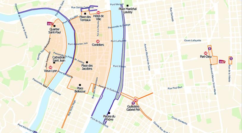 - Dans le Vieux-Lyon : délimité par la place de la Commanderie, rue Saint-Georges, rue Caillat, montée du Gourguillon, place de la Trinité, rue Tramassac, rue du Boeuf, montée des Chazeaux, montée Saint-Barthélémy, place Saint-Paul, rue Octavio Mey, quai de Bondy, quai Romain Rolland et quai Fulchiron entre la place de la Commanderie et le pont Bonaparte.
