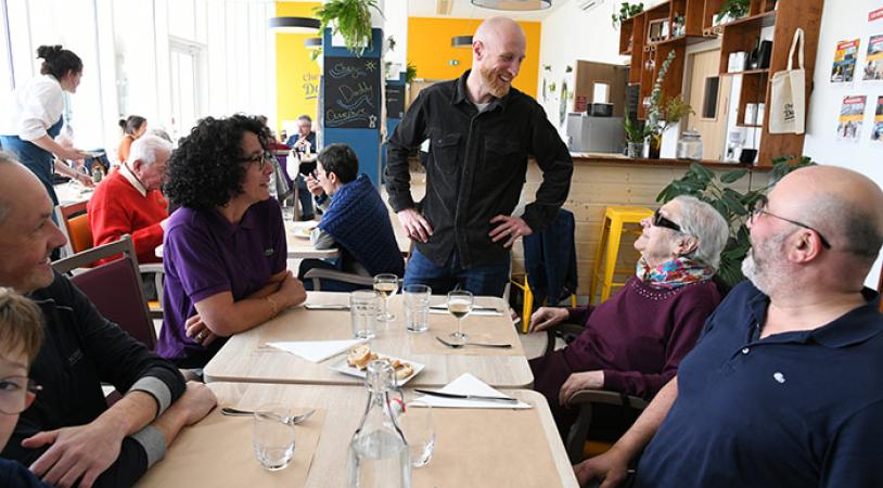 Ici tout rayonne ! Et ce n’est pas dû uniquement à la couleur jaune qui recouvre les murs ni à la lumière du soleil qui pénètre pas la grande baie vitrée donnant sur la cour intérieure. Il suffit de s’asseoir quelques instants au bar à l’heure du déjeuner pour voir les sourires sur les visages et saisir la chaleur des échanges entre les clients et l’équipe de salariés, services civiques, bénévoles qui s’affairent au service. C’est le principe fondateur de « Chez Daddy » créé par Philippe Albanel en octobre 2021 à la Croix-Rousse : « Lutter contre l’isolement des personnes âgées, créer des rencontres, une famille », rappelle Benjamin Giaccobi, responsable du deuxième « Chez Daddy » ouvert en février dernier cours Suchet (2e).