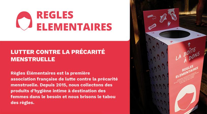Fondée par Tara Heuzé-Sarmini en novembre 2015, Règles Élémentaires est la première association française de lutte contre la précarité menstruelle.
