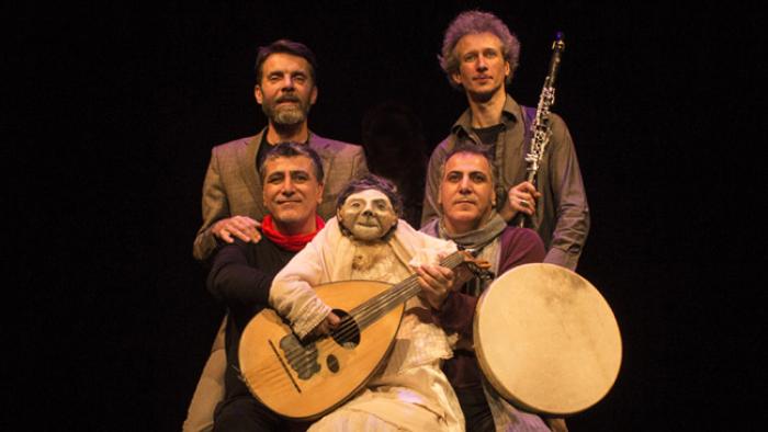 Cette histoire, ils ont décidé de la raconter en musiques et en images. C’est ainsi qu’a été créé On ne vole pas qu’avec des ailes, un spectacle musical où les mythes d’Orient et d’Occident se mélangent et se fondent. Au plateau, les musiciens syriens Khaled et Mohanad Aljaramani, aujourd’hui exilés en France et le clarinettiste français Raphël Vuillard nous entraînent dans leur univers musical métissé au son de l’oud, des percussions, des clarinettes et du chant envoûtant des deux frères. À leurs voix se mêle celle d’un comédien-manipulateur qui prête son timbre à une grand-mère marionnette, conteuse de fables. Un vidéaste capte en direct et projette ses images sur une sphère géante tandis qu’un sound designer promène les sons dans l’espace.