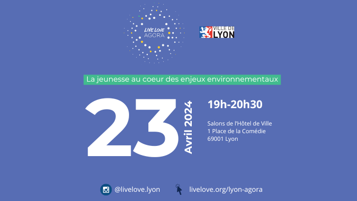 Live Love Agora est un projet lauréat de la Bourse jeunes de la Ville de Lyon. Il invite à participer à la démarche Lyon 2030 et à mieux connaître les acteurs engagés sur le territoire lyonnais. Live Love Agora propose une approche pédagogique de formation, de sensibilisation et d'implication active de la jeunesse lyonnaise aux enjeux climatiques et à la vie citoyenne, à travers de nombreux événements culturels jusqu'à l'horizon 2030. Cette première édition propose deux tables rondes en présence et avec la participation de Marie Alcover, conseillère déléguée aux Jeunesses à la Ville de Lyon.