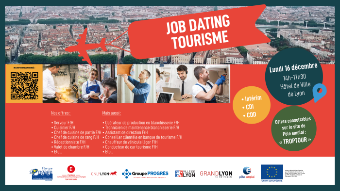 La Maison Métropolitaine d’Insertion pour l’emploi, OnlyLyon, Le Progrès, la Ville de Lyon, la Métropole de Lyon et Pôle emploi organisent le lundi 16 décembre 2019 de 14h à 17h30 à l’Hôtel de Ville de Lyon un Job Dating Tourisme dans le cadre des Trophées du Tourisme qui auront lieu le soir même.