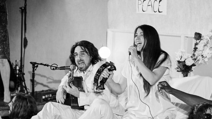 Dans Yoko & John - Chambre 1742, cinq comédiens et comédiennes font ré-entendre les revendications pacifistes du couple mythique. Car au-delà des mots, ce Bed-in à portée politique fut aussi un moment de création artistique intense, avec la composition de chansons, de dessins et de slogans.
