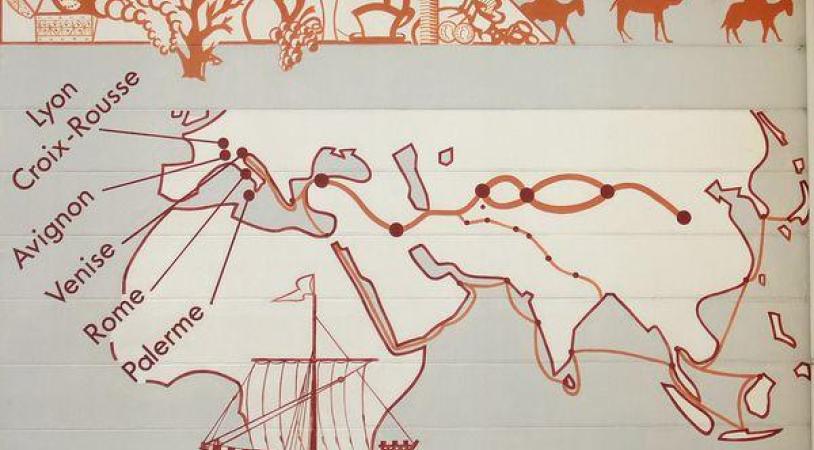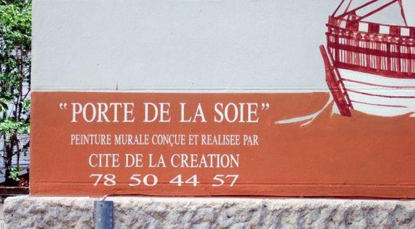 Tapisserie sur façade et broderie au pinceau pour ce vaste portique en trompe l'oeil. Au coeur du quartier des canuts, la porte s'ouvre sur les Routes de la soie, oeuvre qui valut à ses auteurs le label Unesco.