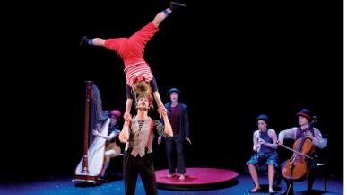Un sextet composé d’un duo de voltigeurs circassiens, d’un violoncelliste, d’une clarinettiste, d’une harpiste et d’une danseuse-chanteuse.